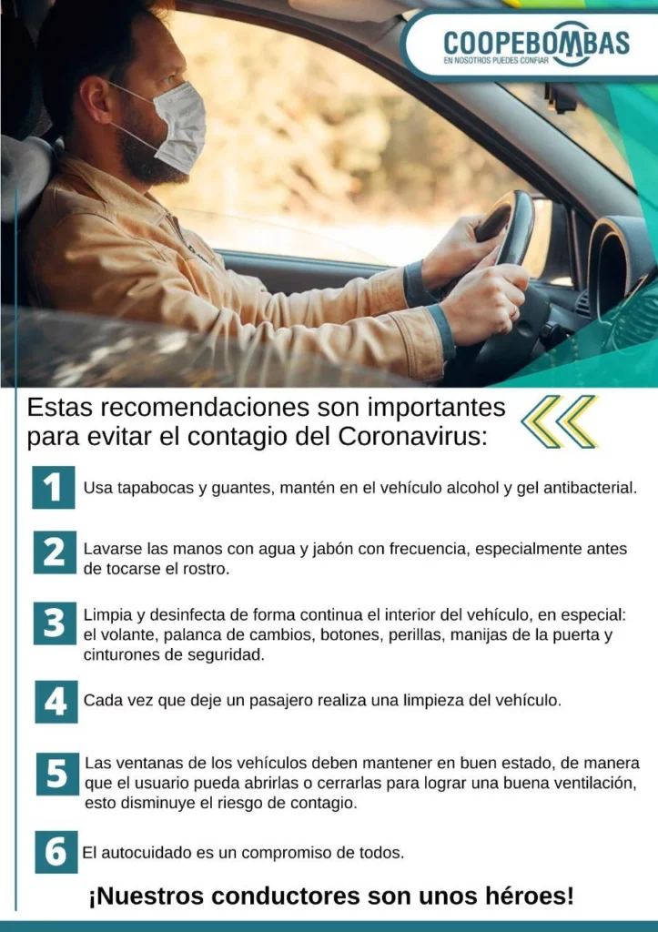 En Coopebombas estamos altamente comprometidos con la salud y el bienestar de nuestros conductores y usuarios. Estas recomendaciones son importantes para evitar el contagio del Coronavirus: