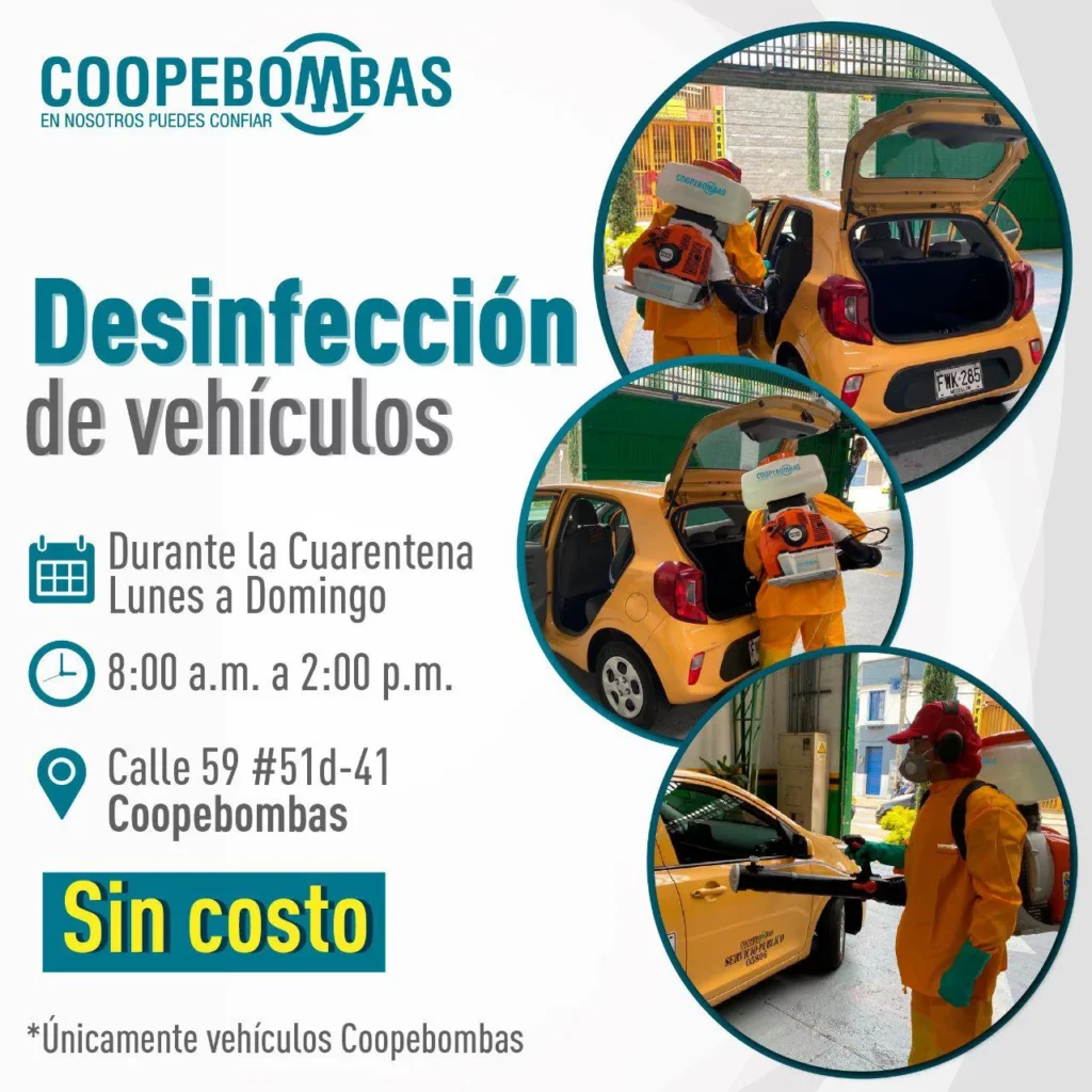 Hoy iniciamos las jornadas de desinfección de los taxis Coopebombas 🚕💙. Este servicio no tiene ningún costo. La salud y el bienestar de nuestros conductores y usuarios son la prioridad. ¡Unidos saldremos adelante!